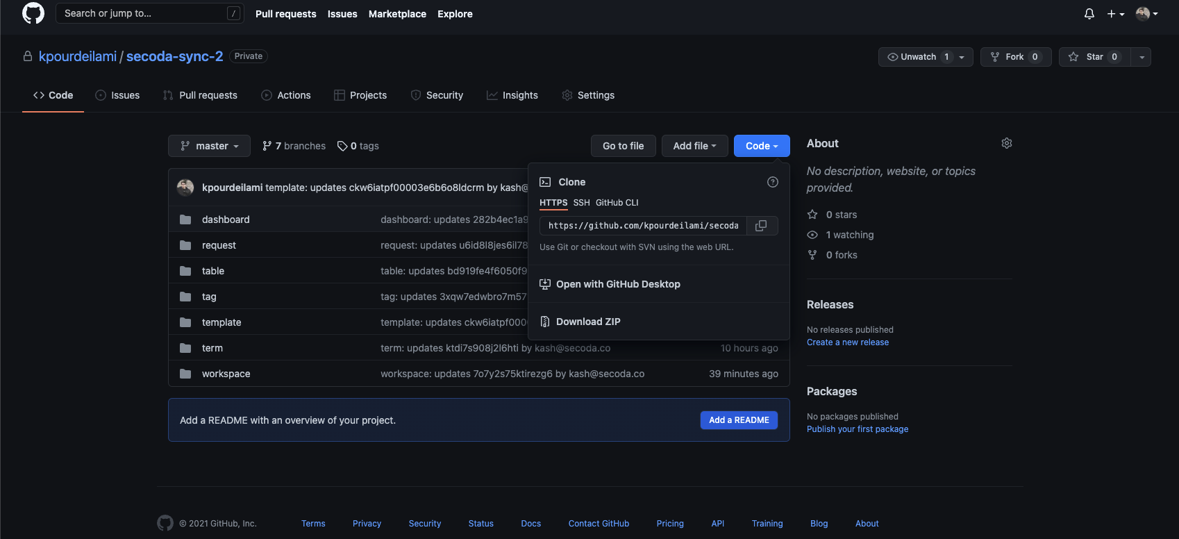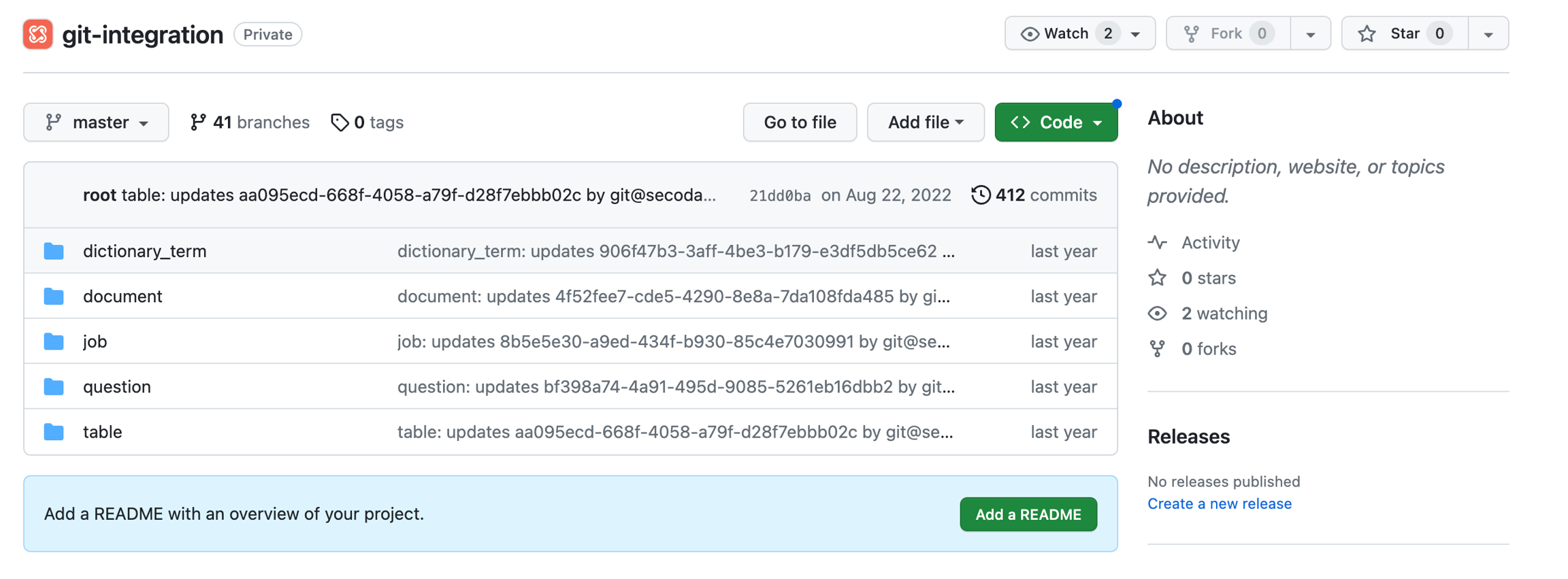 Create an empty Git repository for Secoda to push data to (NOTE: You may have to push an initial empty commit or an empty README file for the Git integration to run successfully)