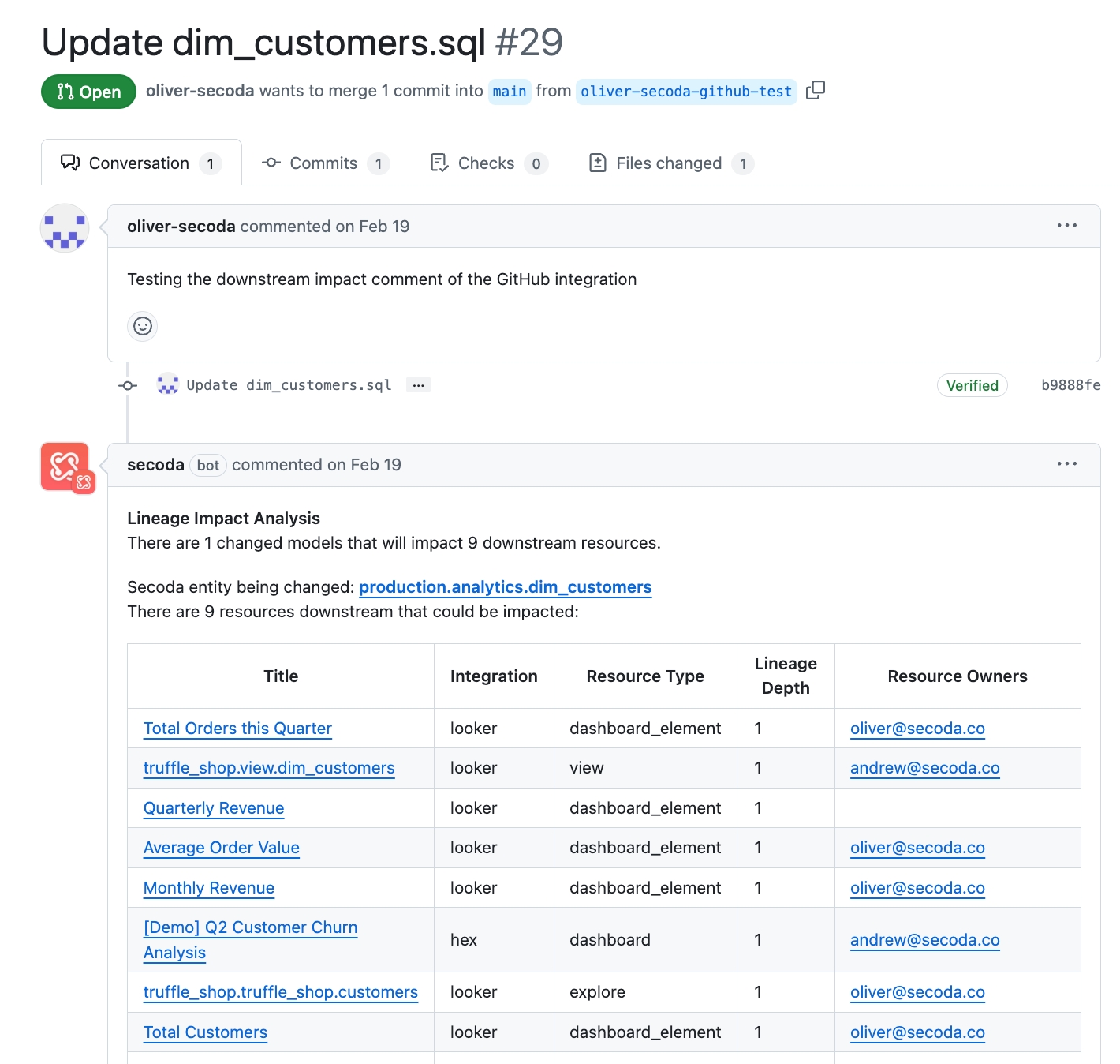 Once the connection is setup, Secoda will check any new pull requests opened in that repository for entities that exist within your workspace. If any deletions are present on the entities, a comment will be written on the pull request of the affected entities, and all immediate downstream entities. An email with the same information will be sent out to all owners of affected entities as well.