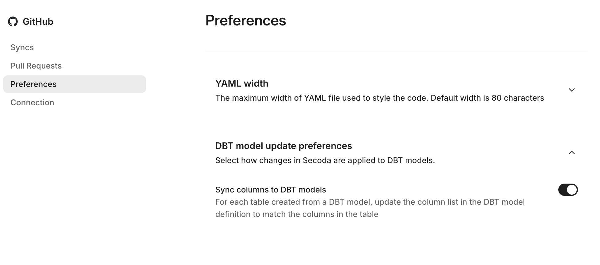 This setting determines whether Secoda should automatically sync column-level metadata — such as column names, descriptions, and tags — from your tables in Secoda back to your dbt model .yml files in GitHub.