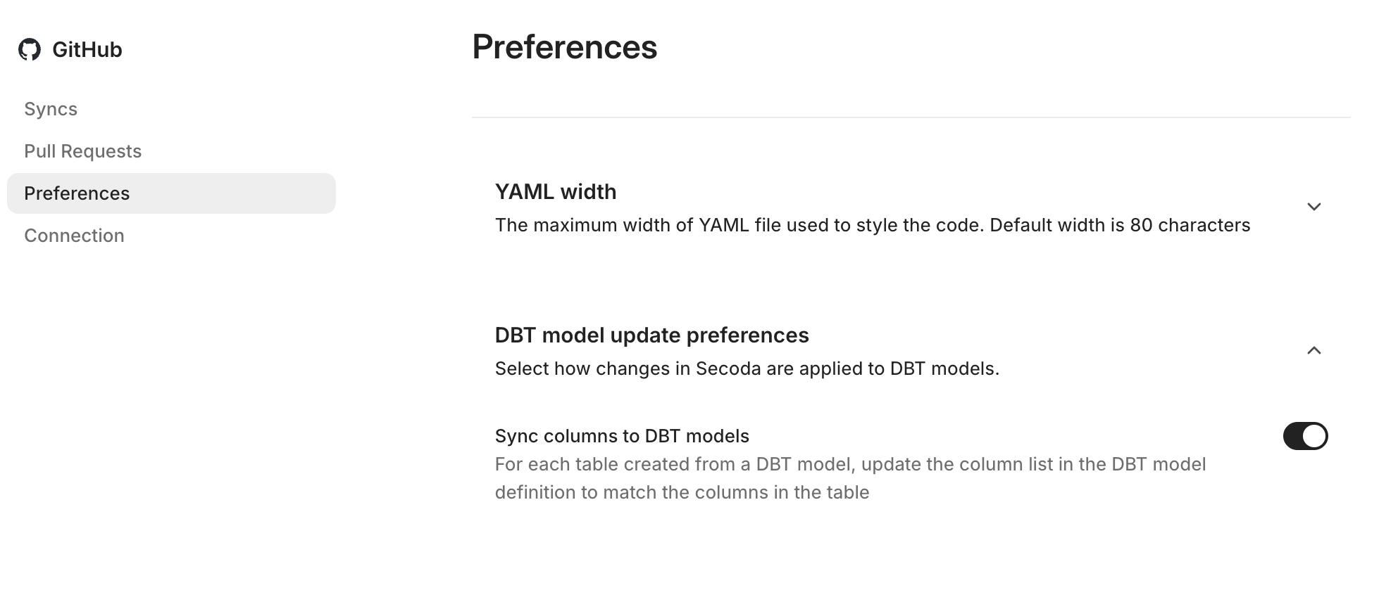 This setting determines whether Secoda should automatically sync column-level metadata — such as column names, descriptions, and tags — from your tables in Secoda back to your dbt model .yml