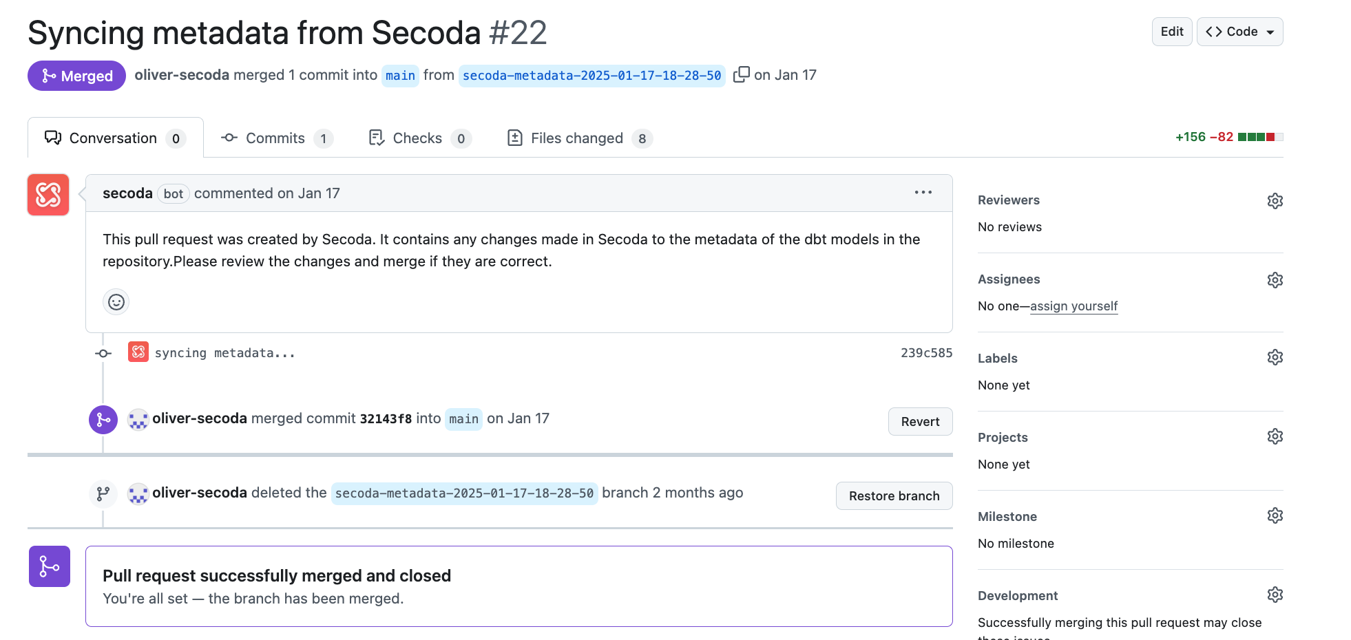 Run a metadata sync to update your dbt resources with the info your have changed in Secoda. When a sync is run, Secoda will update dbt metadata files that relate to Secoda resources in your workspace and create a new pull request in your repositories for you to review before merging. The following metadata will be updated from Secoda: