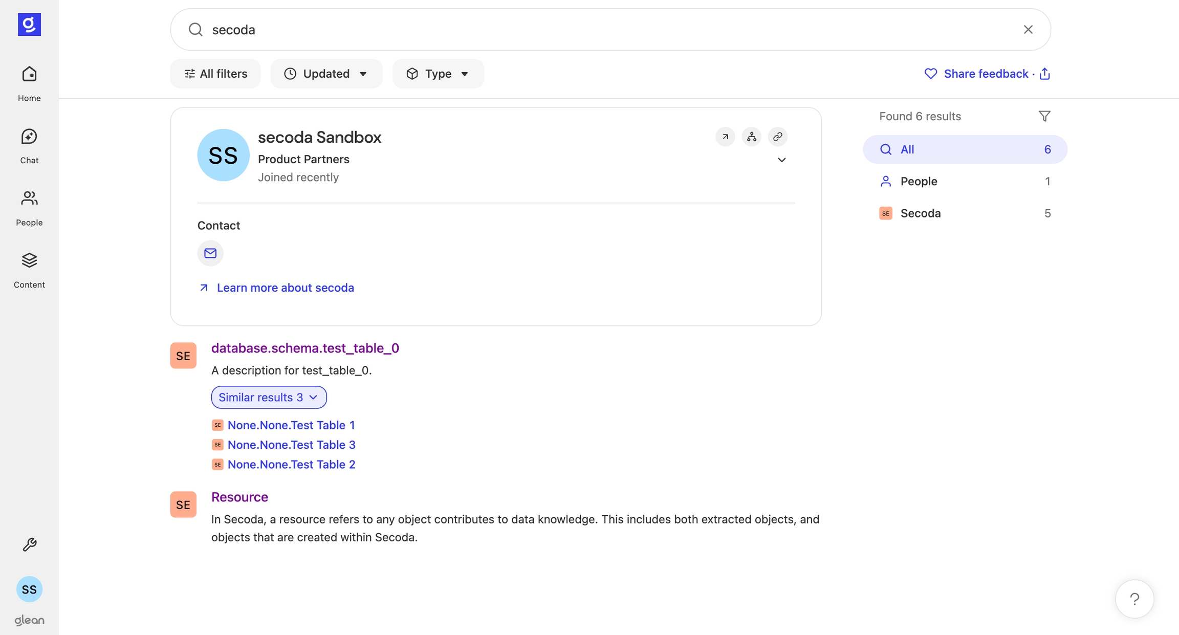 After Secoda resources are indexed in Glean, the metadata and resource itself will begin appearing in search results. The results are hyperlinked to the resource in Secoda.