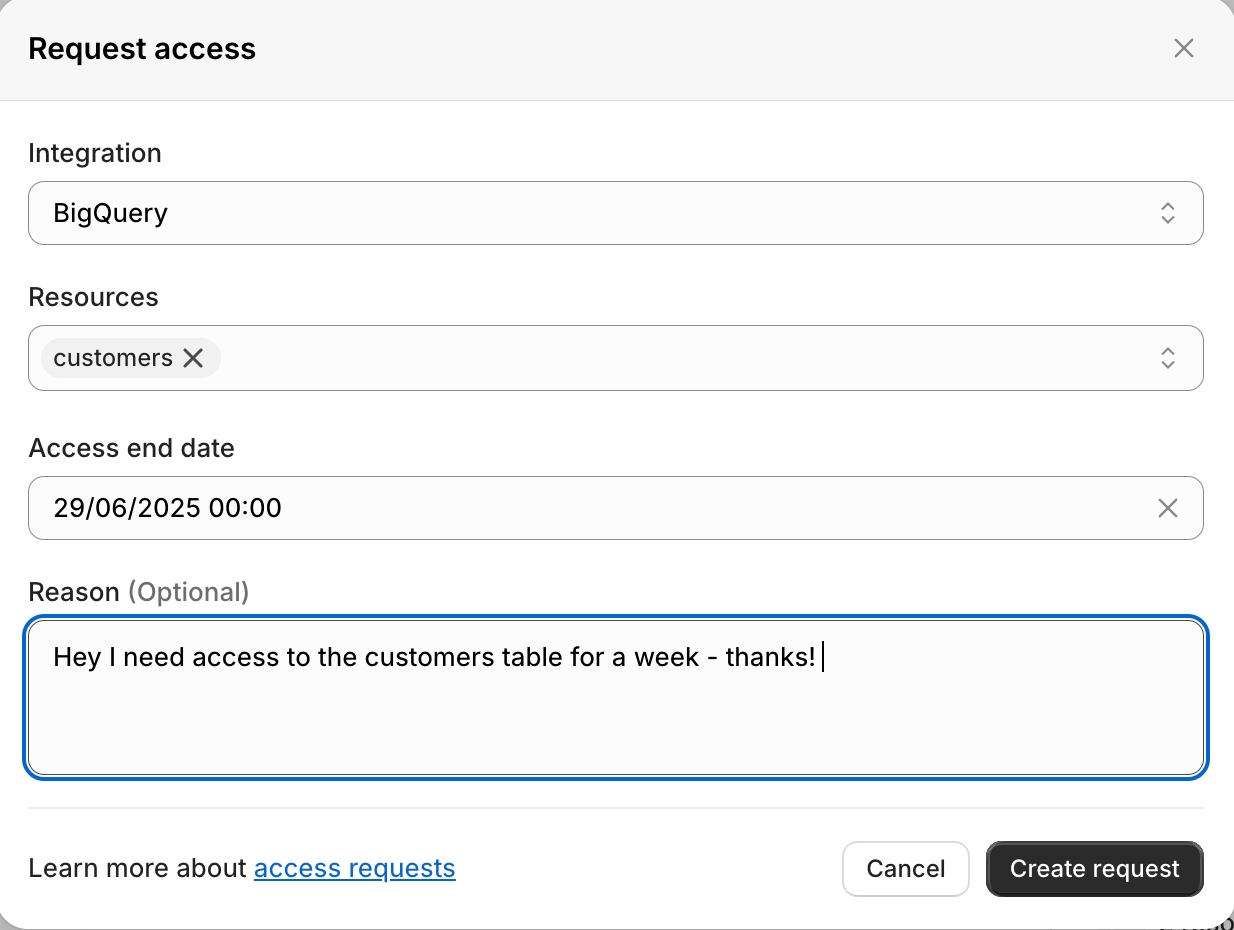 Centralized Requests: Users can create Access requests directly within Secoda, specifying the resources, access duration, and roles.