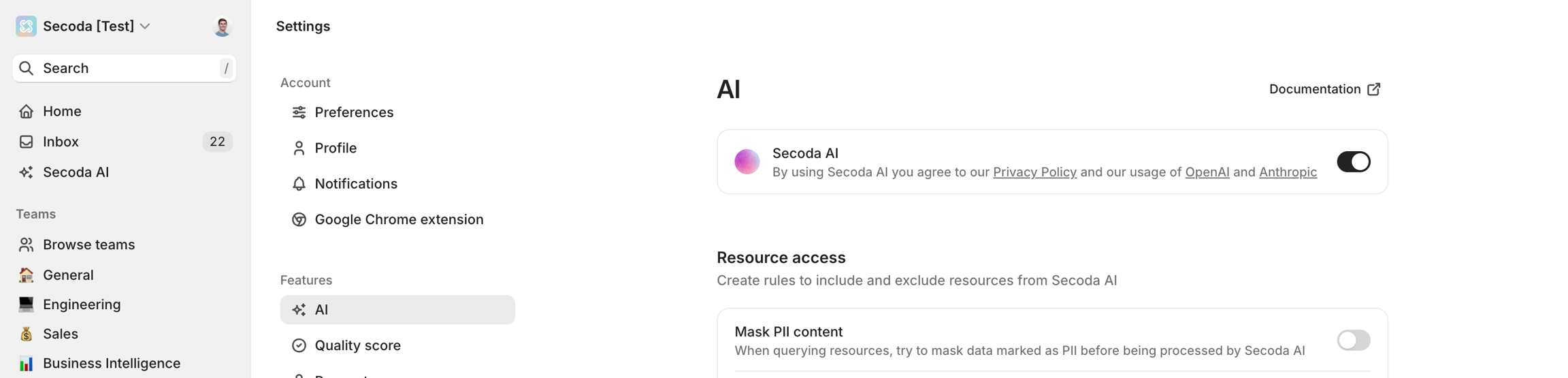 Once enabled, the Secoda AI will appear in the left-hand menu of your workspace.