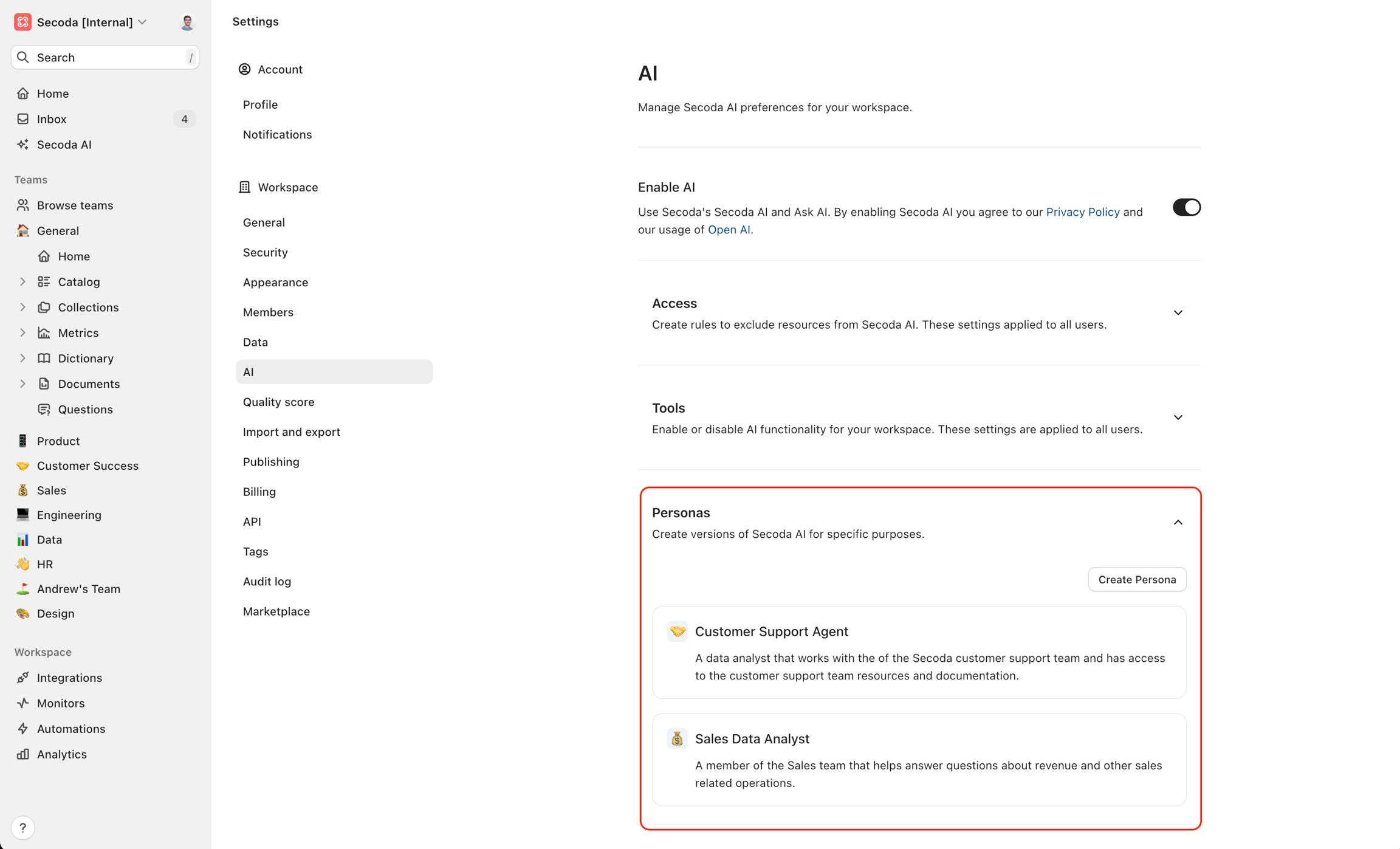 Secoda AI Personas are customizable assistants tailored to specific roles, aligning with team workflows. They access relevant data, support unique instructions, and integrate with tools like Slack. Personas can be personalized with names, icons, and permissions, ensuring the right people use the right tools for enhanced productivity.