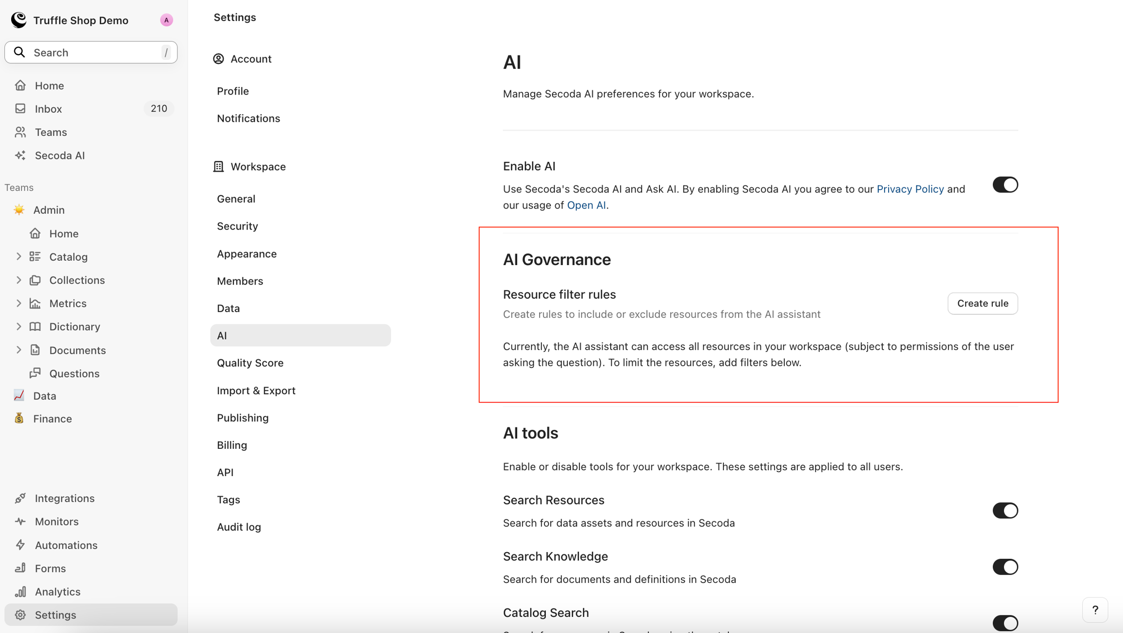 Consistent Configuration: The filter rules for AI are aligned with those used on the Search and Catalog pages, ensuring a unified approach to data governance across the platform.