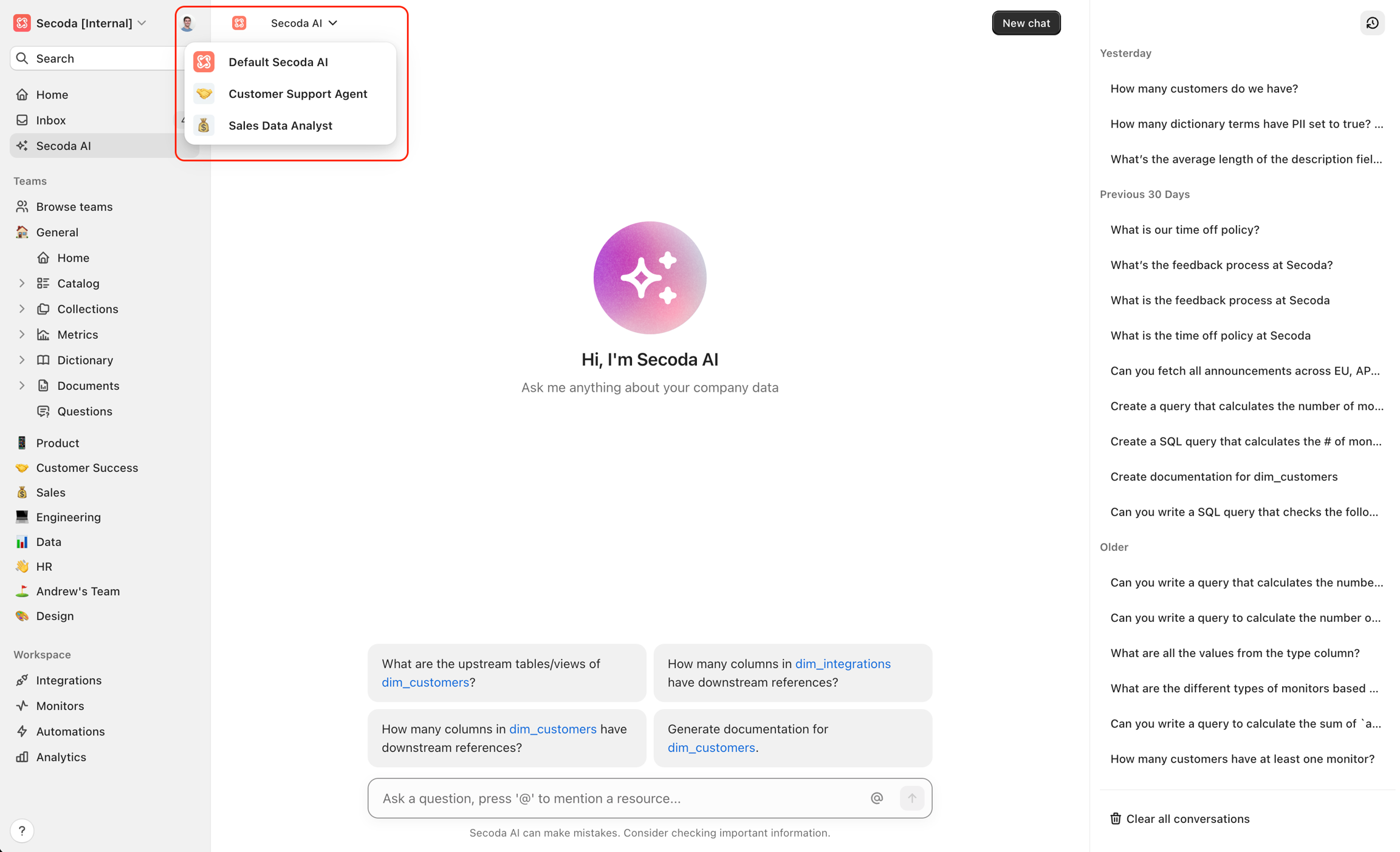 Once your Persona has been created, you can switch between Personas on the Secoda AI page. After that you can chat with your Secoda AI Persona similar to how you chat with Secoda AI.
