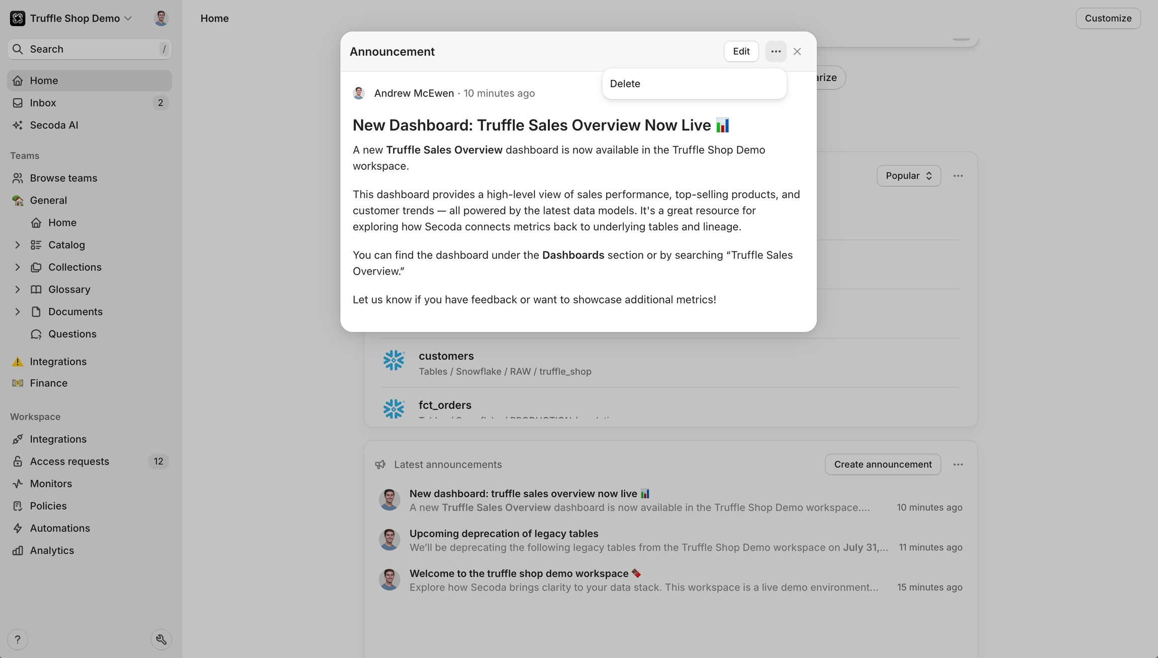 Once you send an announcement, notifications are immediately dispatched to recipients through their Secoda inbox and any configured Slack channels.