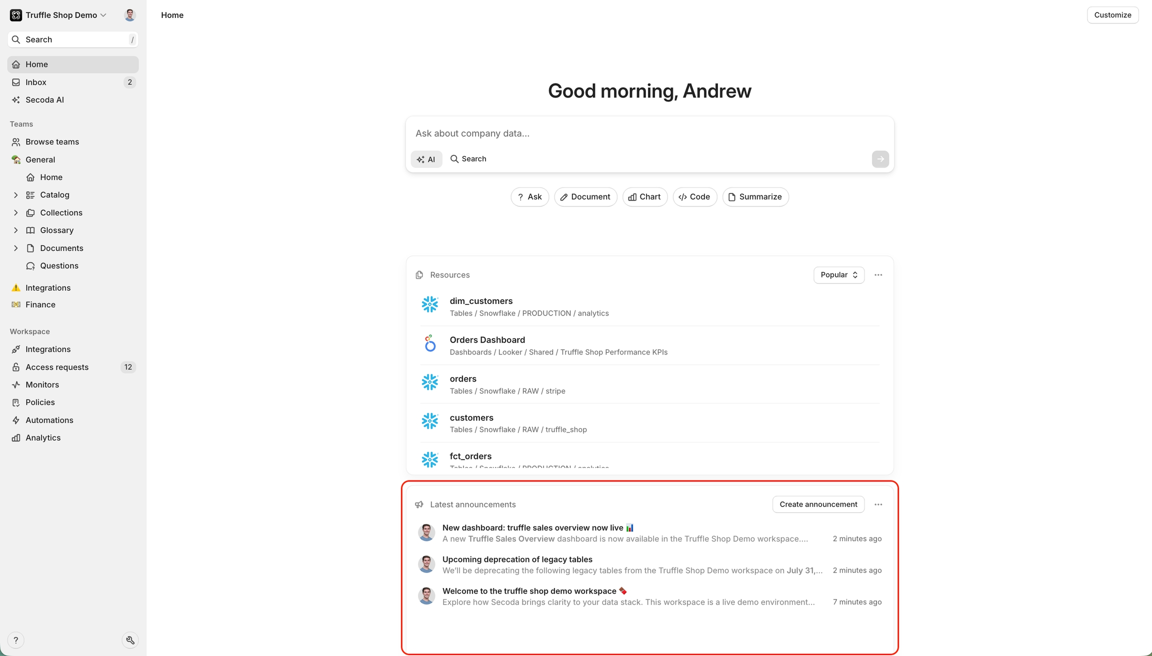 Announcements ensure critical information reaches the right people at the right time, whether it's about new data sources, policy changes, feature releases, or team updates. They can be sent to specific users or broadcast to the entire workspace, with optional Slack integration for maximum visibility.