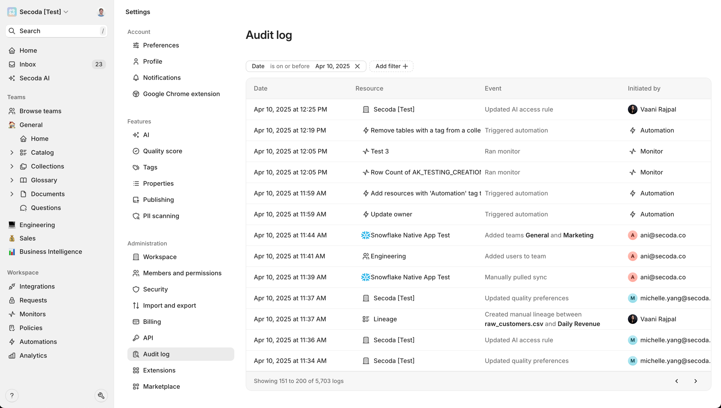 The Audit Log provides a comprehensive timeline of all activities and changes made within your Secoda workspace. This feature helps you track user actions, monitor changes, and maintain accountability across your data documentation.