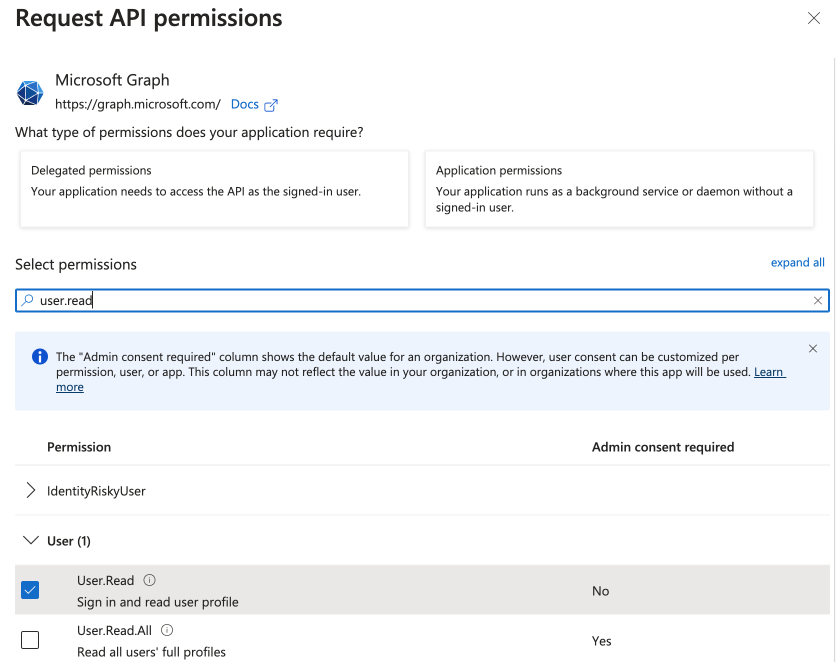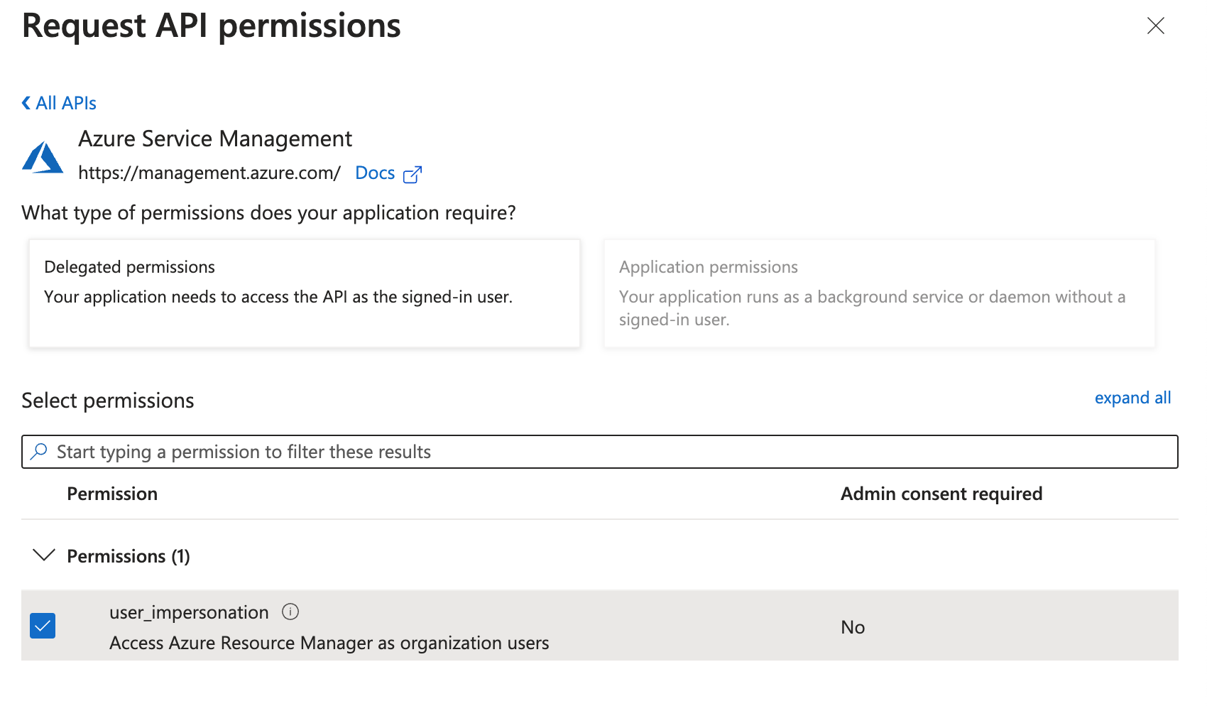 In the Manage -> API Permissions section of your App Registration, add the permissions Azure Service Management.user_impersonation and Microsoft Graph.user_read