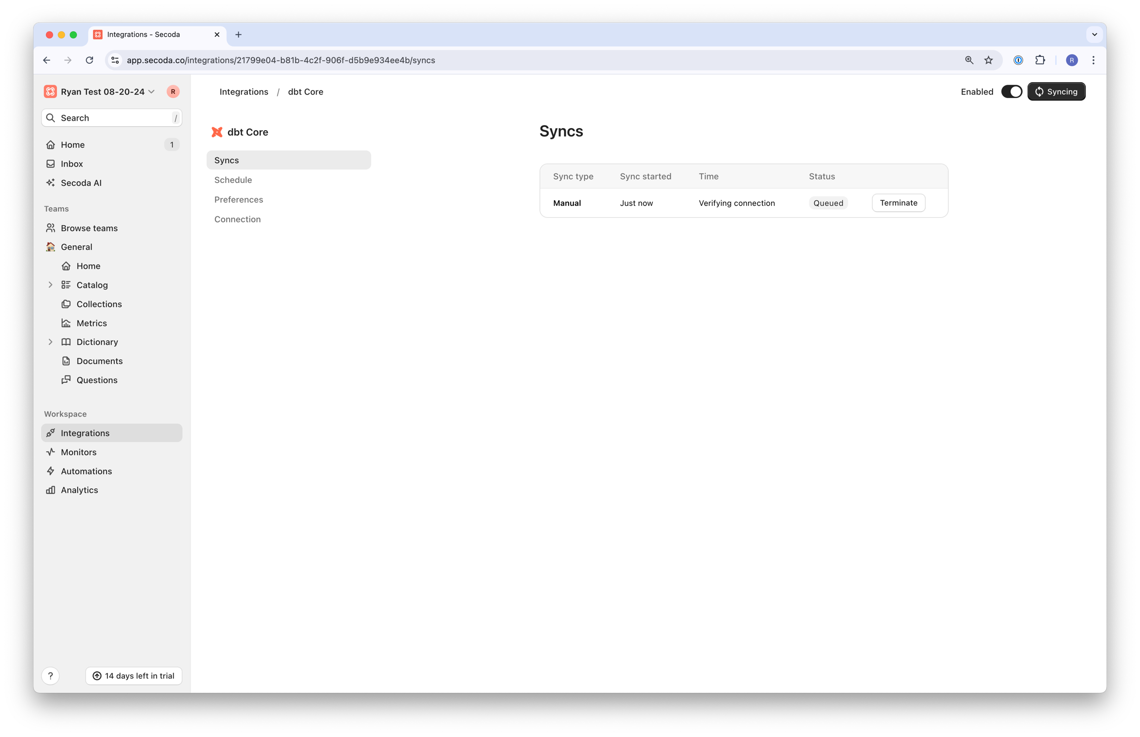 Return to https://app.secoda.co/integrations and click on the dbt Core integration that was just created. Save the ID which is contained in the URL.