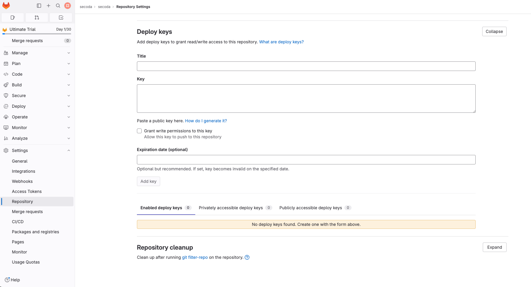 Once in your GitLab repo, click on Settings > Deploy keys on the sidebar.