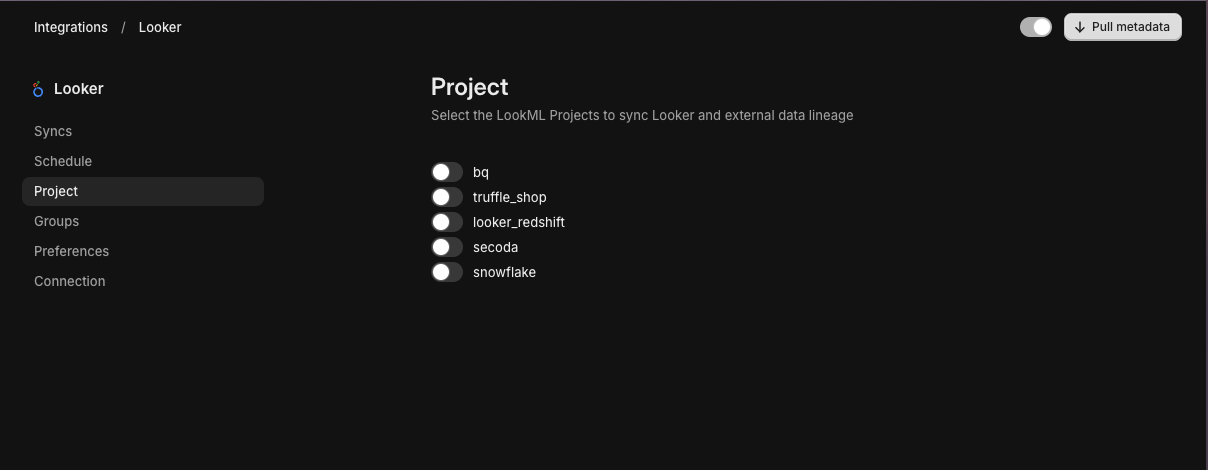 Navigate to the Project tab on the Looker Integration Page and you will see your LookML projects. For each project you want to connect, click the toggle beside the project name.