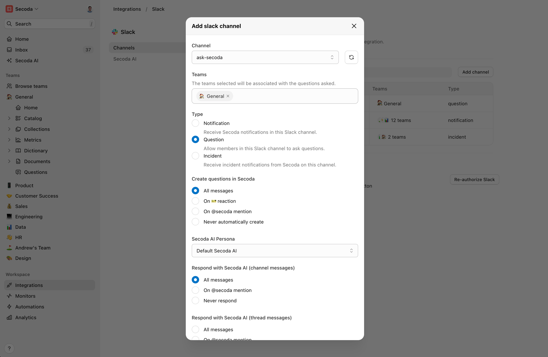 • Setup: Create or select a channel for questions, such as #data-questions. Ensure Secoda is added to the channel to enable bi-directional syncing. Configure the behaviour for pushing threads to Secoda questions and how Secoda AI responds to the questions.