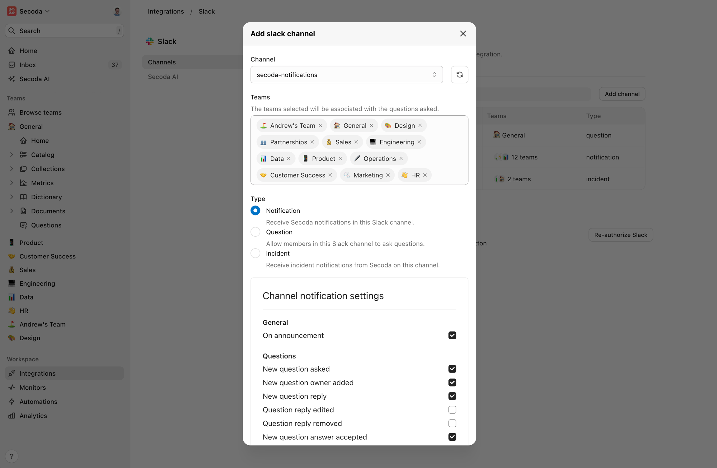 • Setup: Create or select a channel for notifications, such as #secoda-notifications. Configure the notification preferences in Secoda to send updates to this channel.