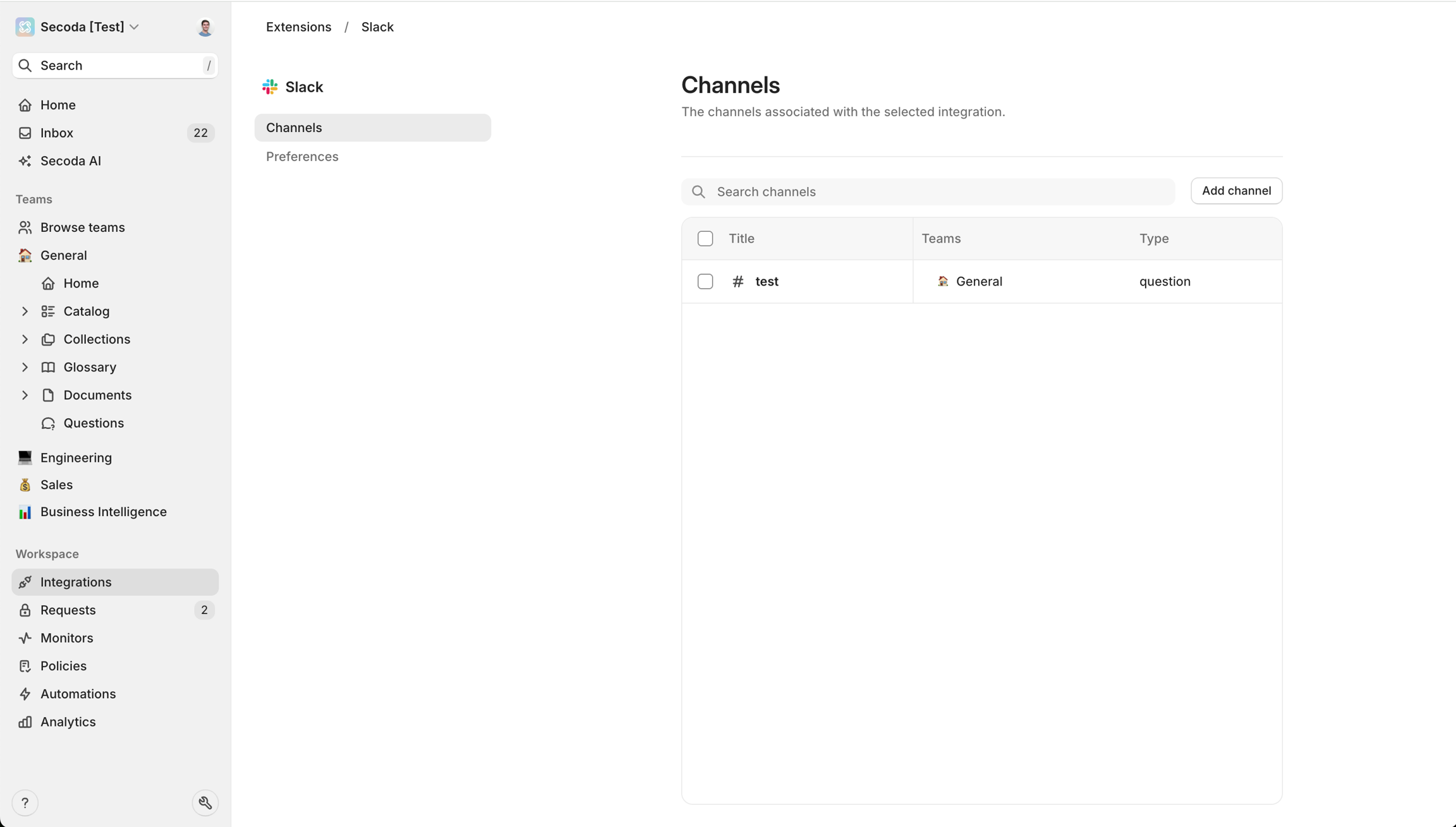 The Secoda Slack extension allows you to streamline communication with your data team and manage incidents directly from Slack. To make the most of this extension, you can configure dedicated Slack channels for different types of interactions. Here’s how to set up each type of channel.