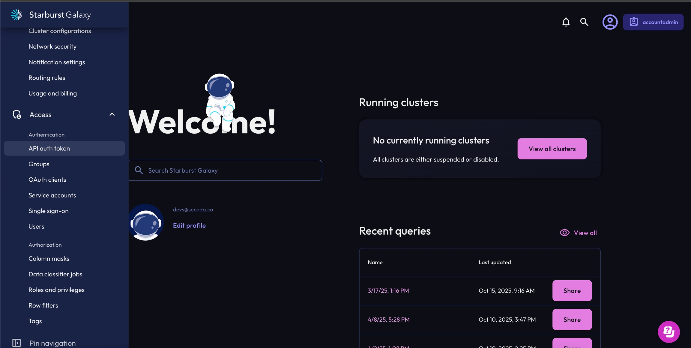 The Starburst API uses authentication tokens to allow access, so create a new auth token for secoda by following these steps: