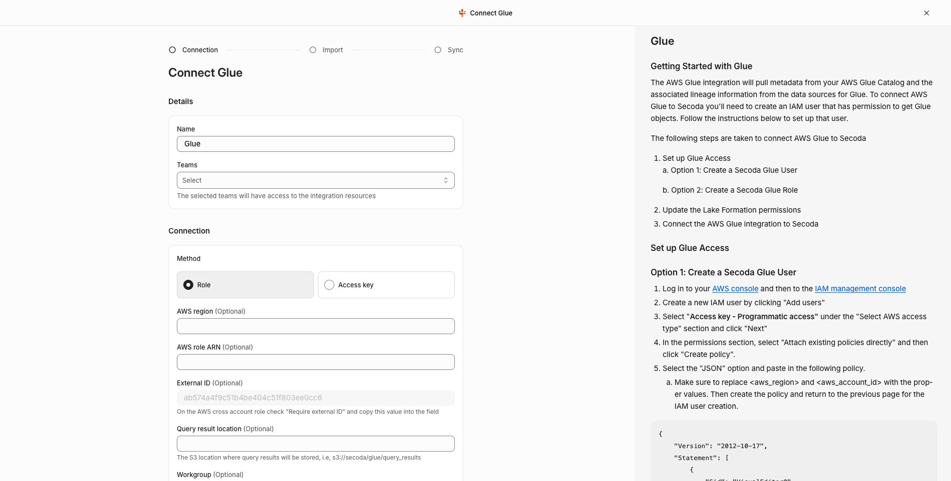 The Secoda UI will display an AWS Account ID and a randomly generated External ID, as shown below, which must be plugged into an IAM Role you create in your AWS account. Store these values for future reference.