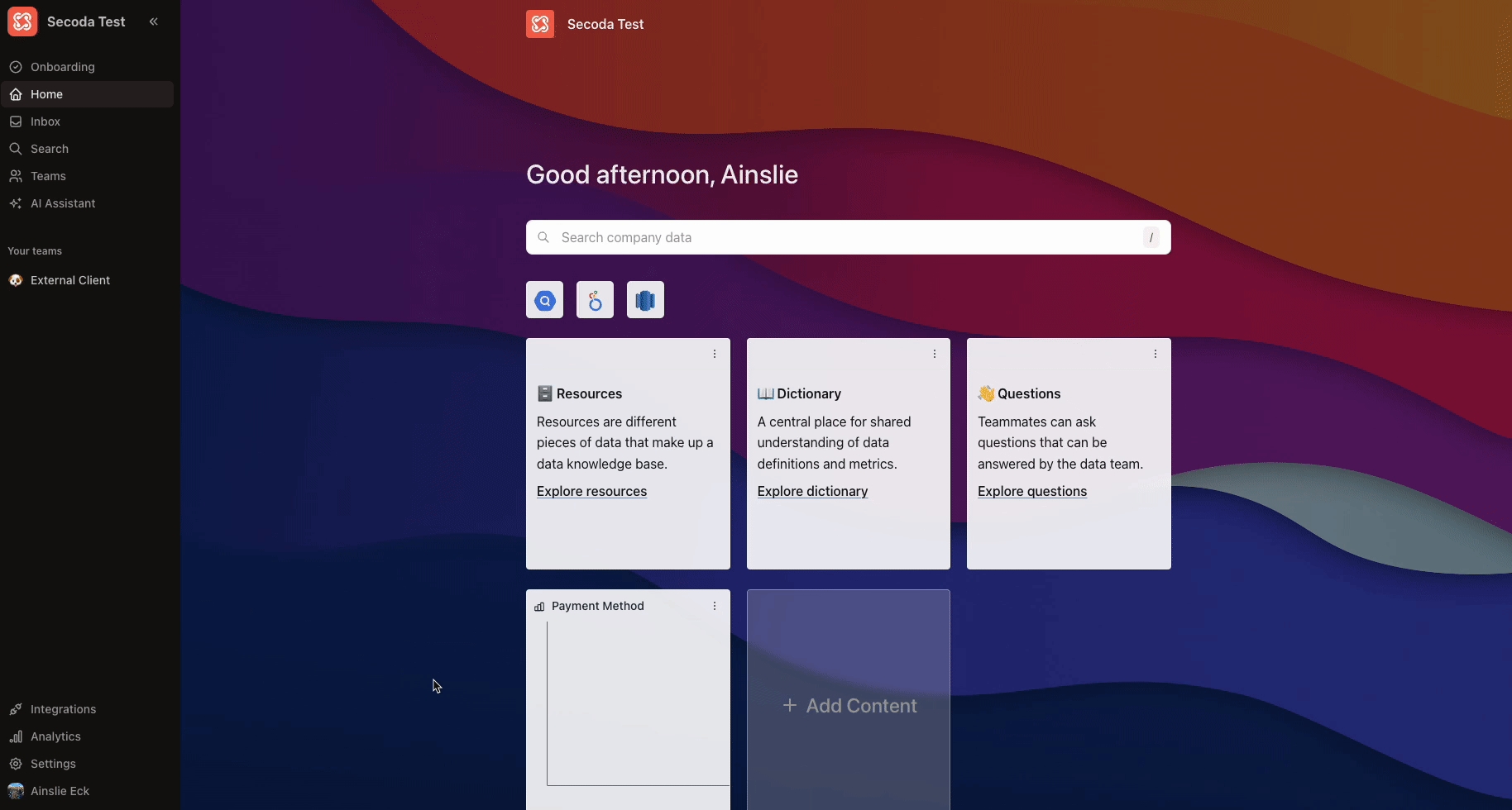 Start documenting and making your data discoverable for your team by connecting your data resources to Secoda.