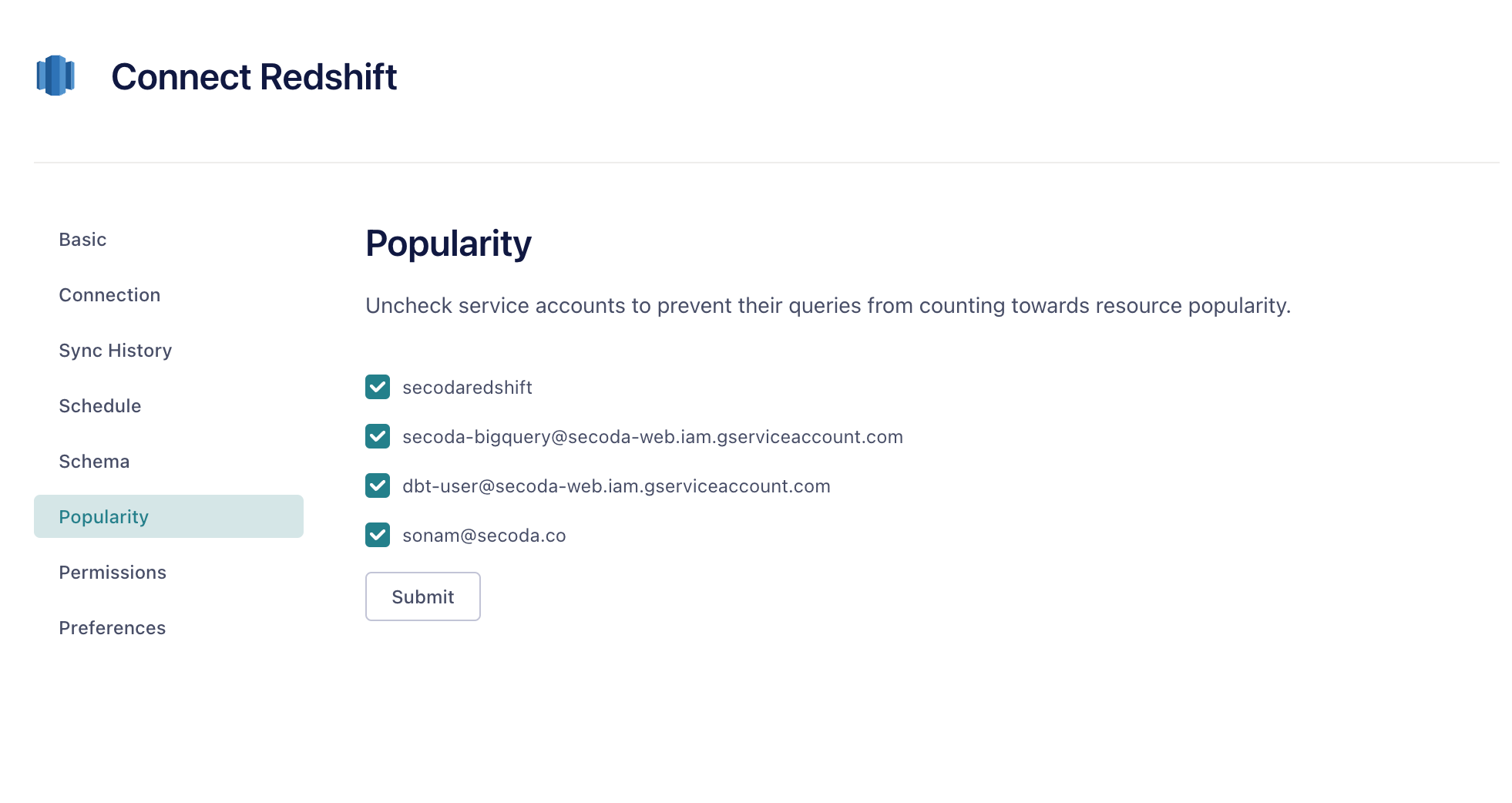 For example, if [email protected] runs a query against your Redshift instance, but is not a member of the Secoda workspace, [email protected] will be considered a Service Account in Secoda and will show up in the Popularity tab of the integrations settings as seen below.