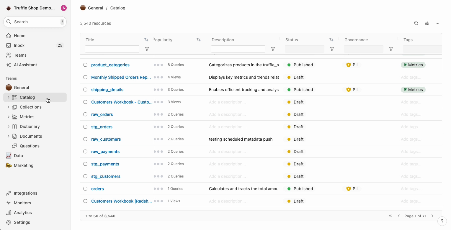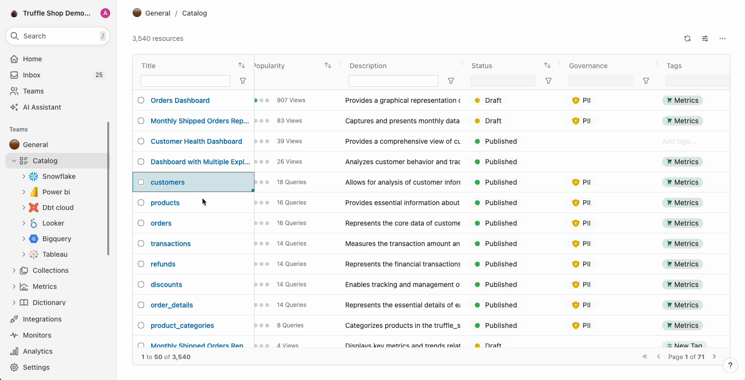 create and save search filters that you often go back to? Let's say you and your teammates often searching for the columns that are tagged as PII. To save these filter, simply create a Search view which can be shared with specific Teams.