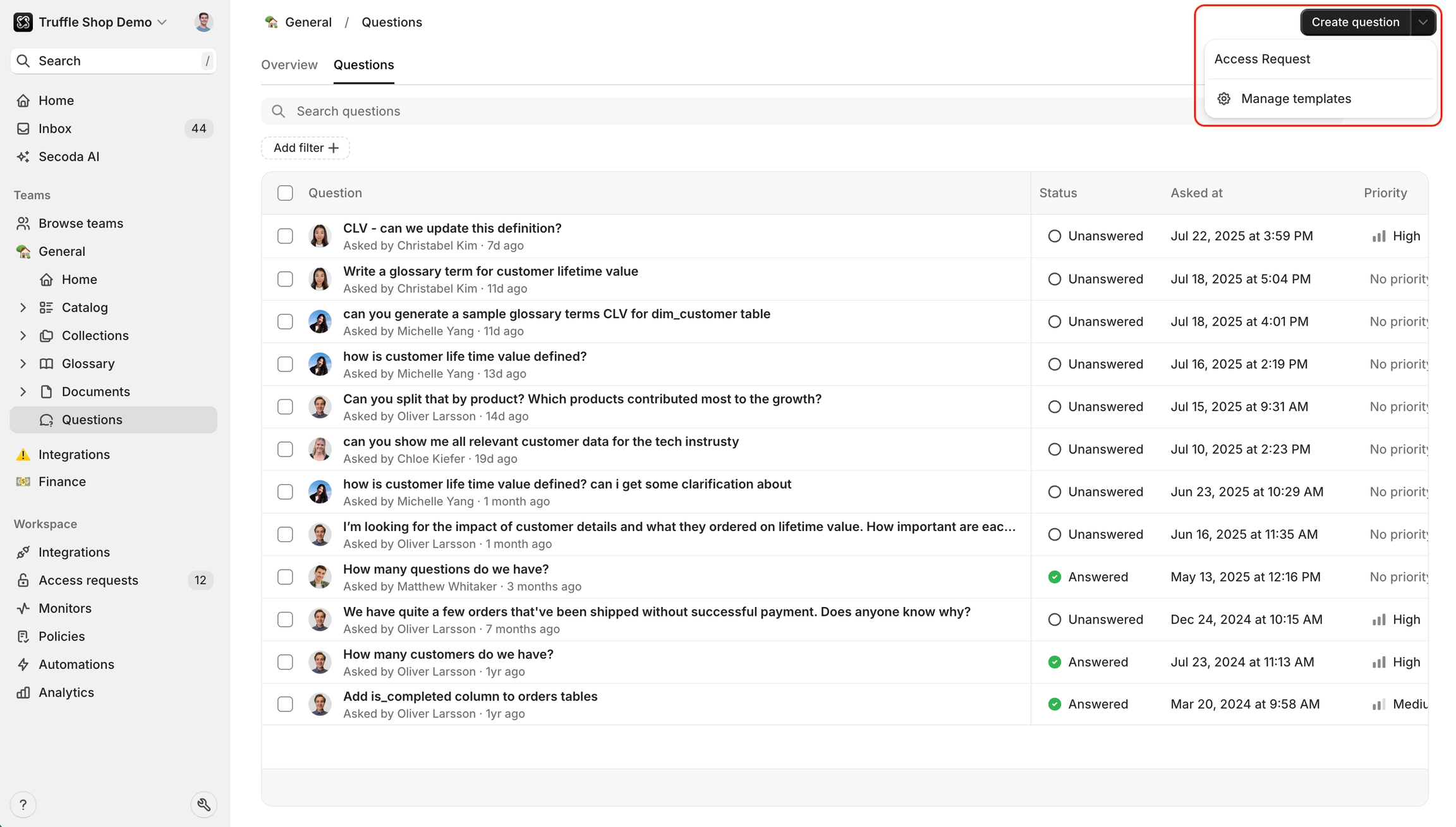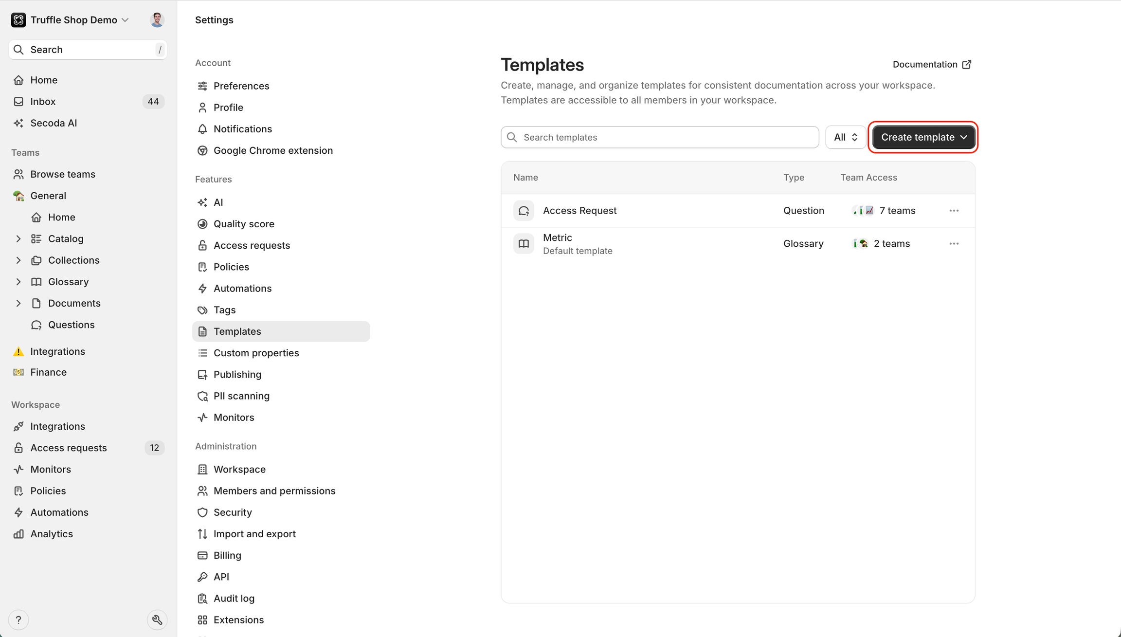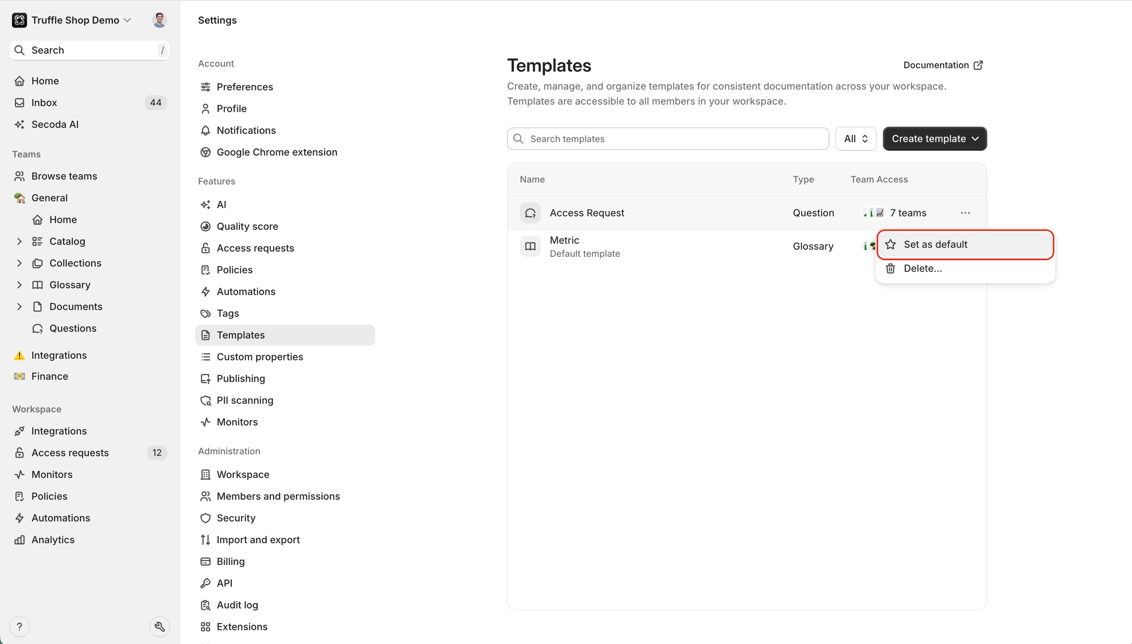 Admins can create templates for data questions, documents and glossary terms, and more.