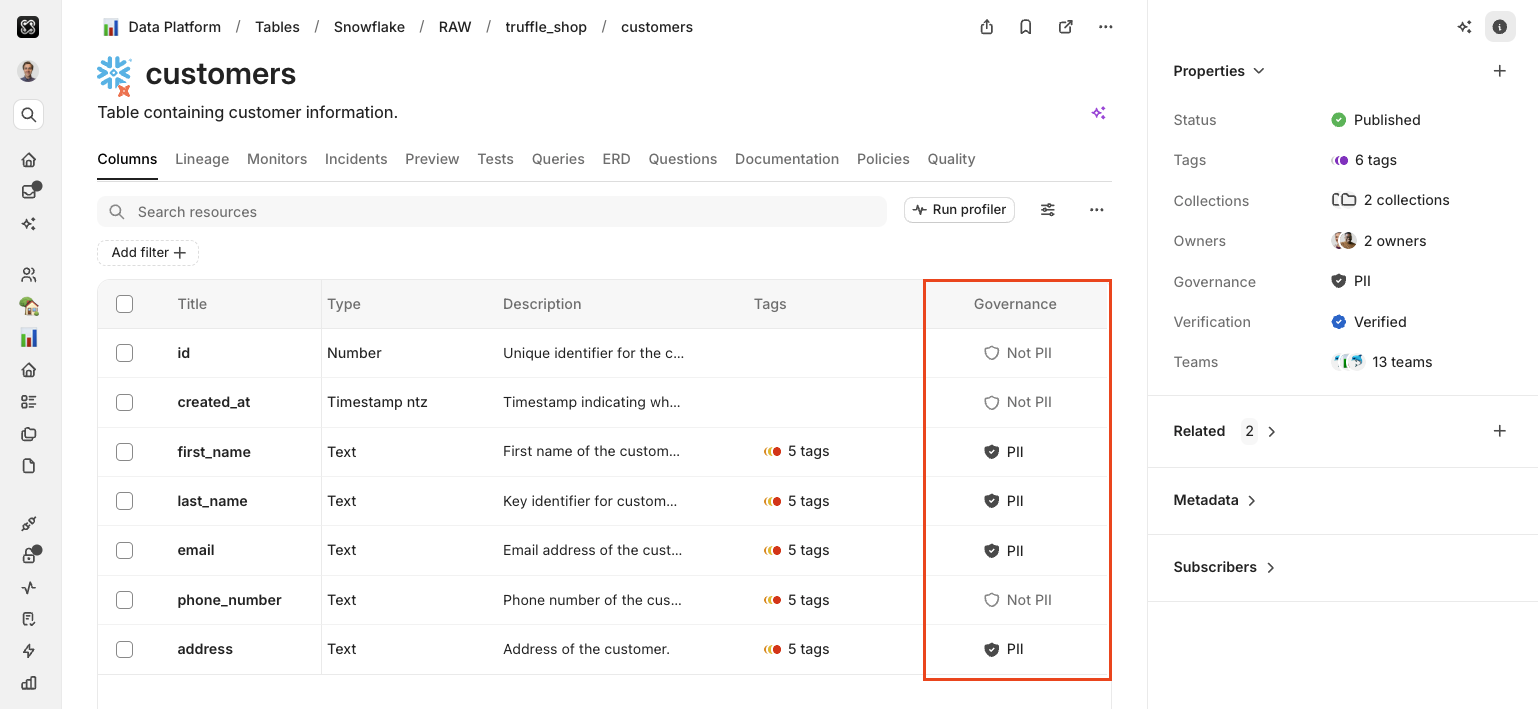 After tagging your data with the PII tag, these will populate in the Governance metadata column in your Catalog.