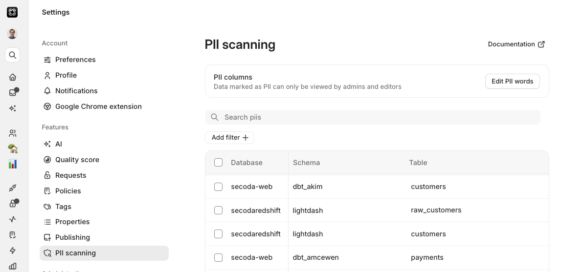 You can easily find and tag PII data in Secoda. To do so, go to Settings -> Features -> PII scanning