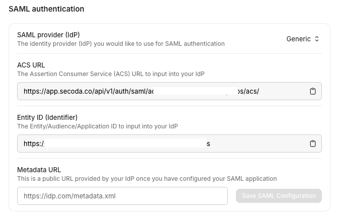 Go to the Secoda app > Settings > Security > SAML. Copy the ACS URL and Entity ID for use in the following steps.